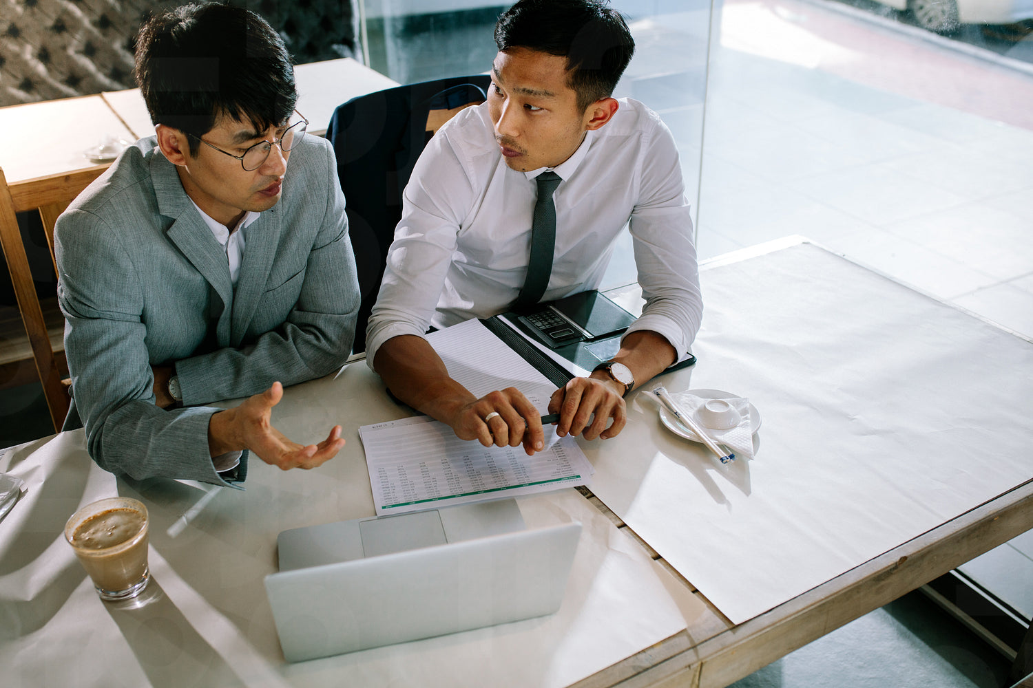 Two business people discussing new project in coffee shop. Asian business men are discussing their work on a table at coffee shop during a meeting.