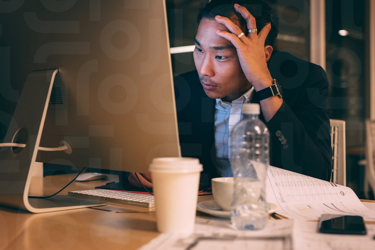 Entrepreneur looking tensed while working late in office. Businessman sitting in front of computer with hand on head working late night.