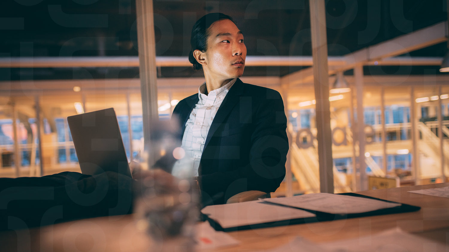 Asian businessman sitting late night in office working on laptop. Entrepreneur looking back while working late in office.