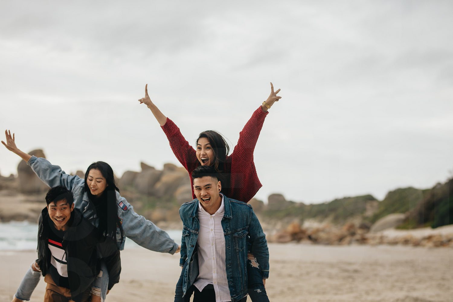Two young couples walking by the beach, with men carrying their women on their back. Couples piggybacking on sea shore.