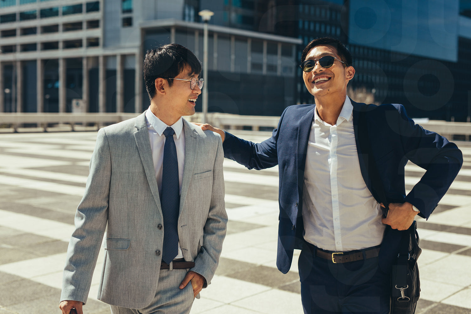 Two smiling businessmen talking and walking in the city