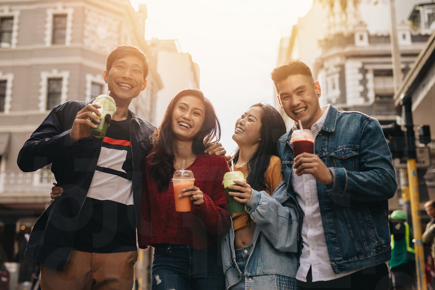 Four young asian walking in the city with fresh juice. Young friends on city street with juice.