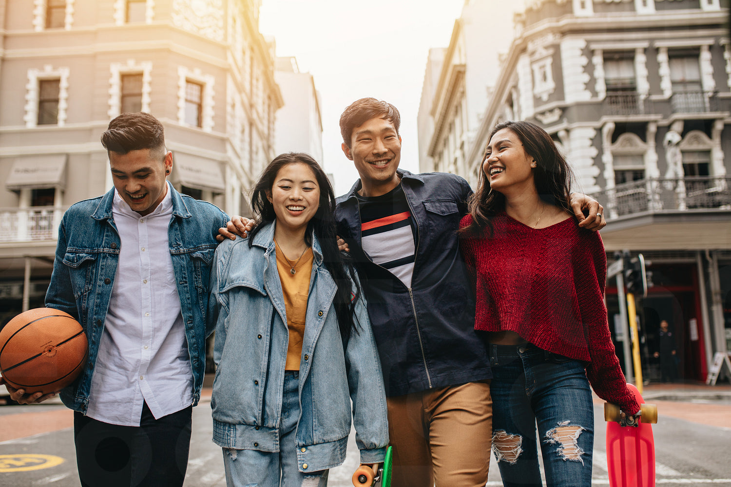 Asian young friends walking together on the street. Group of four people walking with skateboards and basketball.