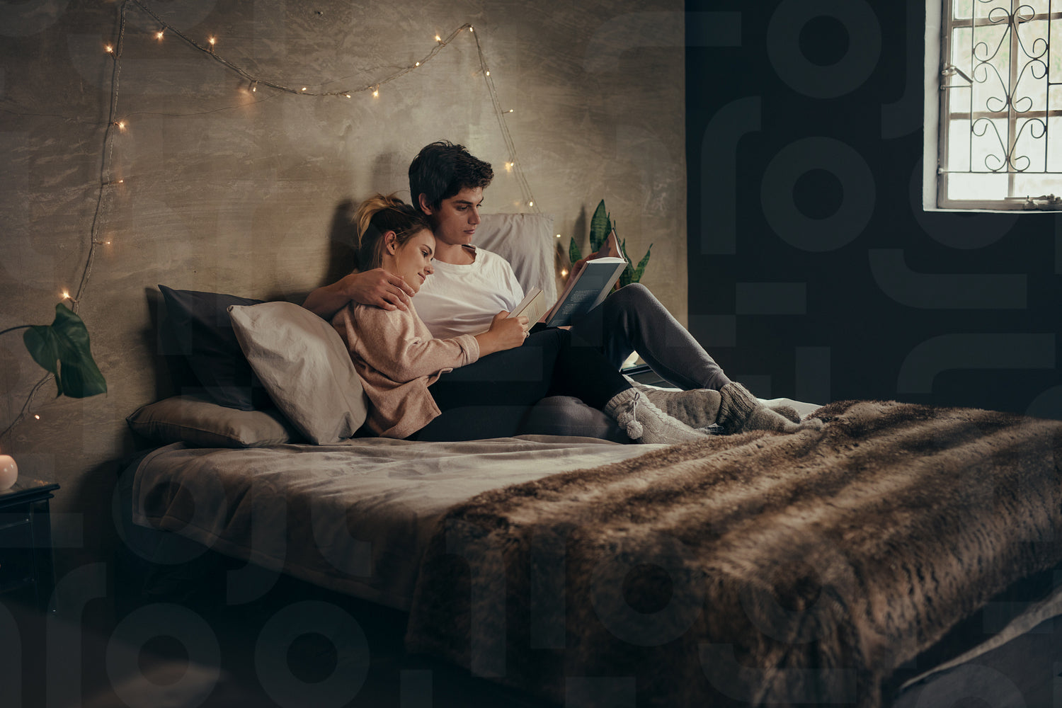Man and woman sitting on bed and reading books. Couple relaxing on bed and reading books.