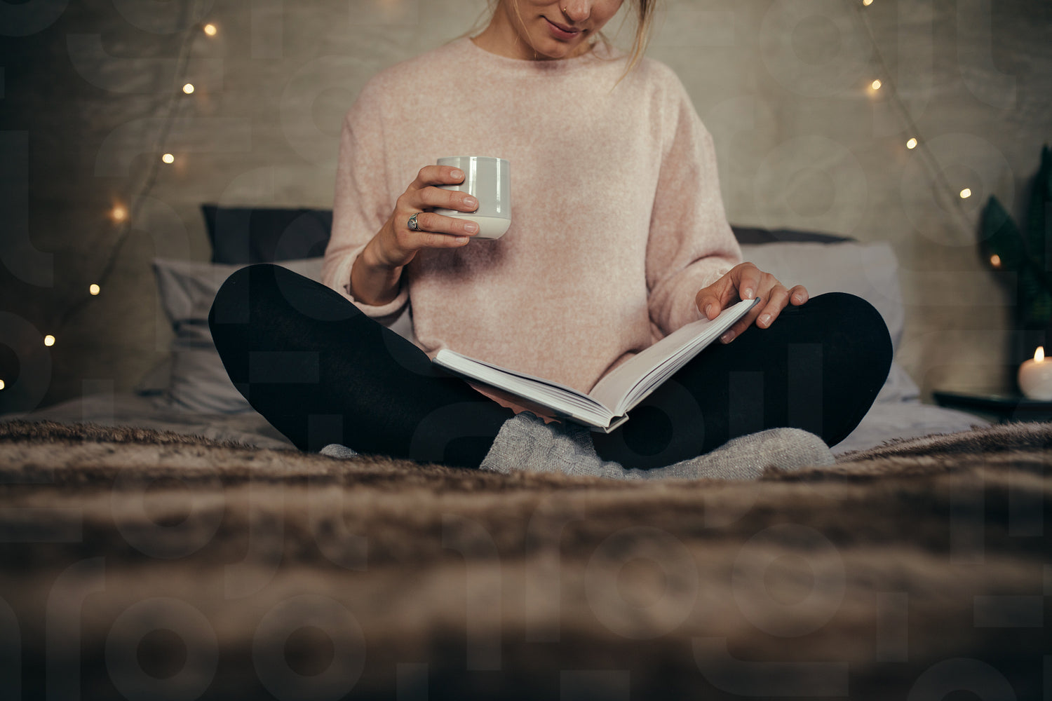 Cropped shot of female sitting on bed reading book and drinking coffee. Woman reading book on bed at home.