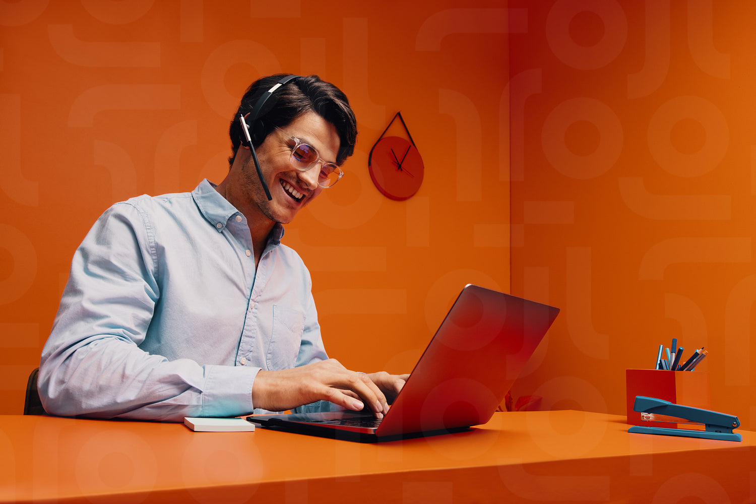 Smiling customer service representative wearing a headset, instructing and typing on laptop in a bright colorful office. Man working in technology, providing excellent service.