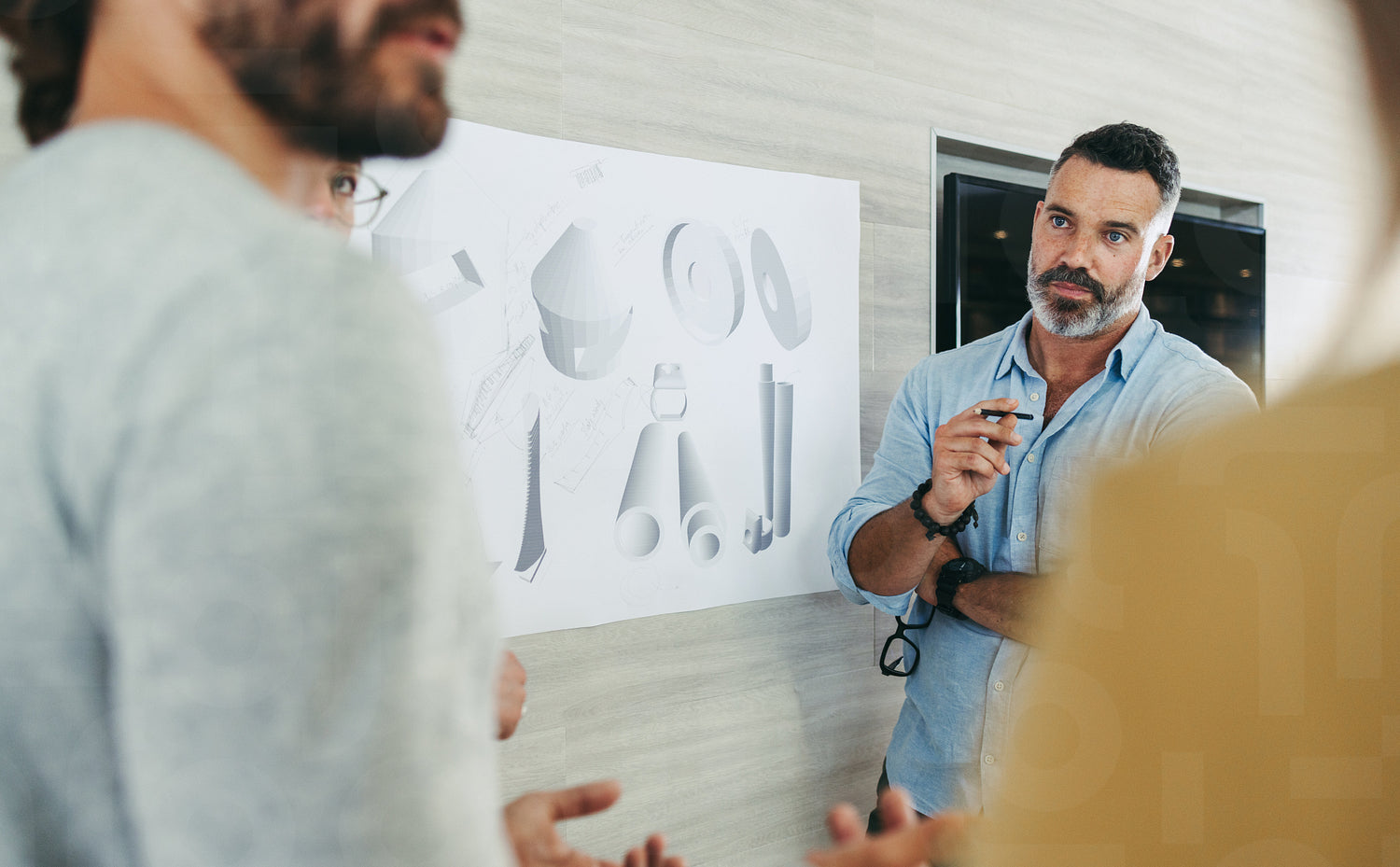 Creative businesspeople having a discussion while working with design drawings in a modern office. Group of innovative designers planning a renewable energy project.