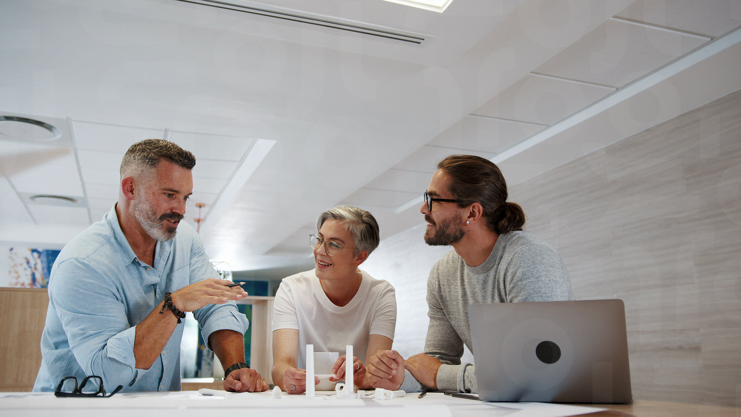 Engineering experts discussing a windmill design in an office