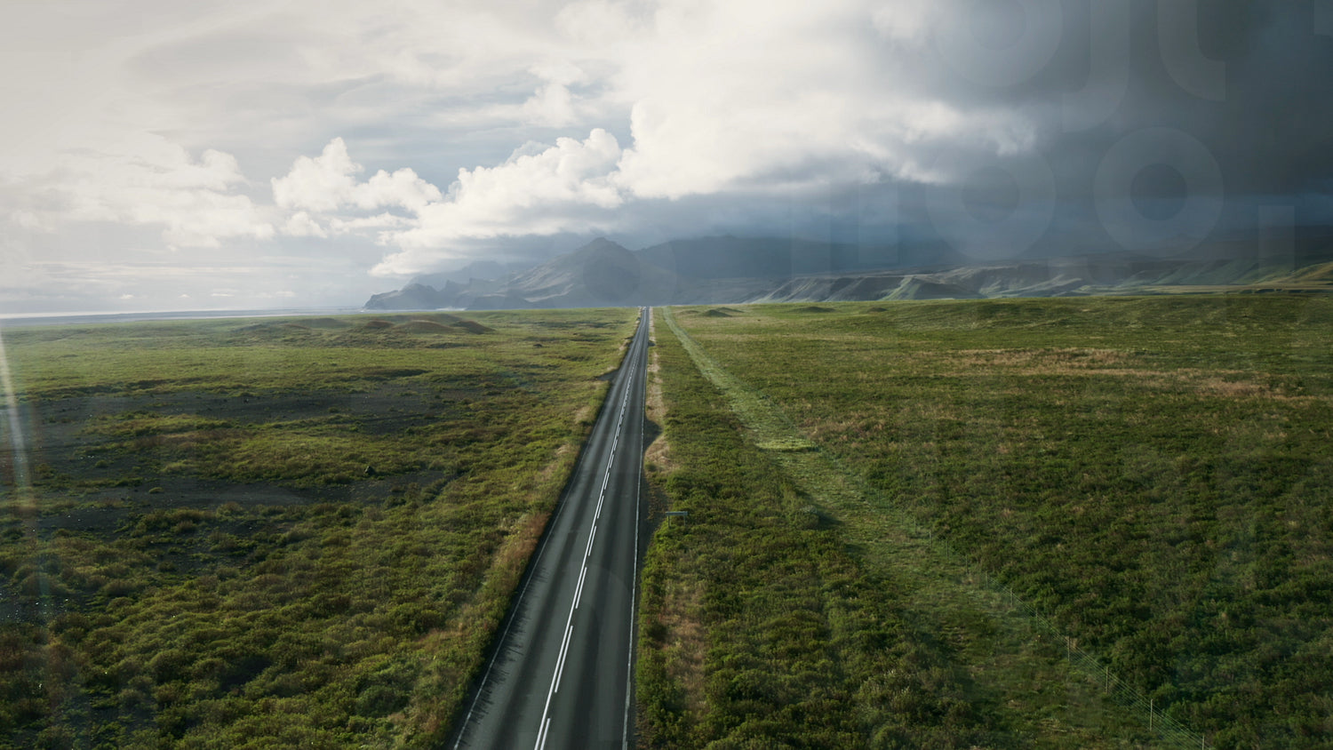 Drone flying over empty highway through lush green landscape in Iceland. Aerial view of beautiful landscape in Iceland in summertime.
