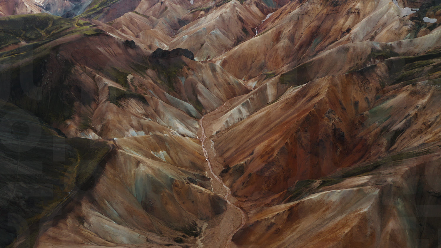 Aerial view of the Landmannalaugar volcanic massif in Iceland. Drone view of colorful rhyolite mountains and vallies.