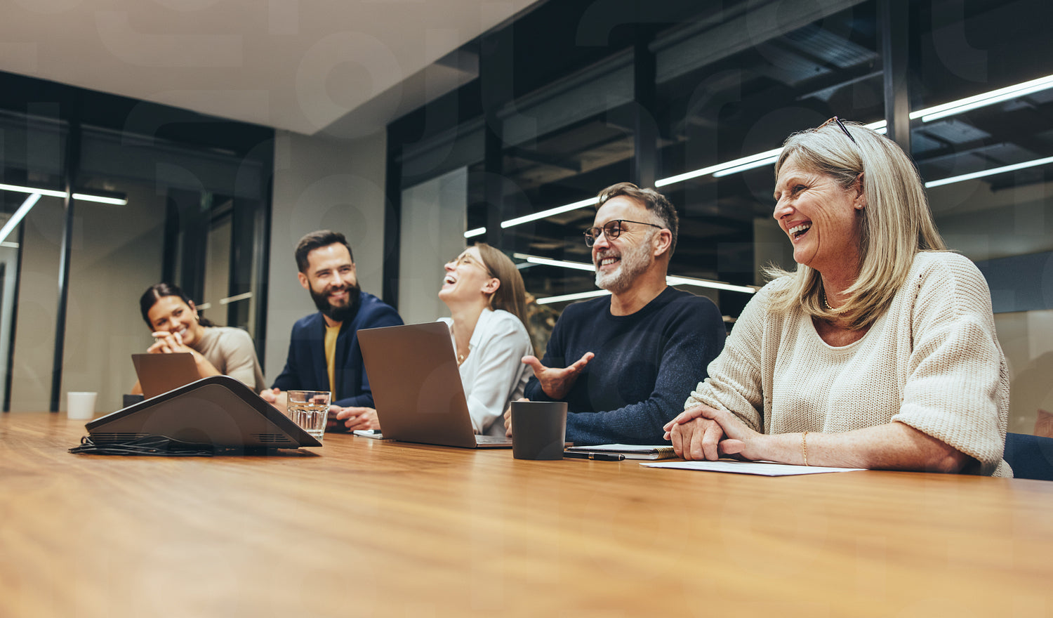 Cheerful businesspeople laughing during a meeting in a boardroom. Team of diverse business professionals enjoying working together in a modern workplace. Colleagues collaborating on a new project.