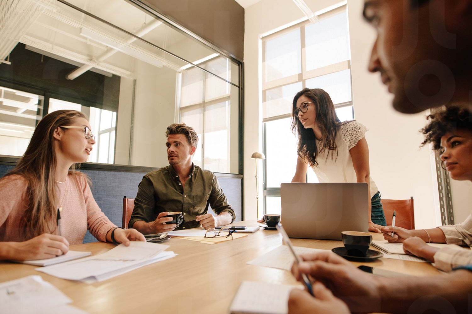 Team of business professionals having meeting in conference room. Business man and woman discussing new strategy in meeting.