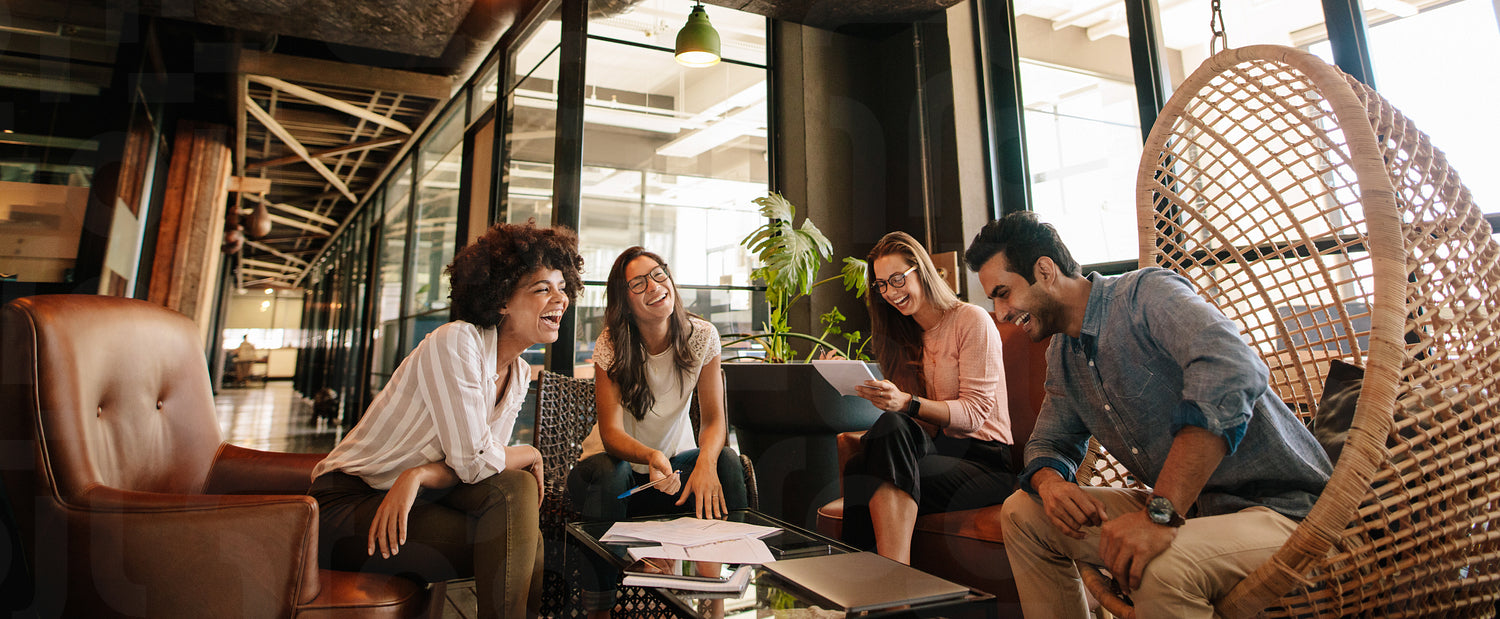 Business team working on new project and smiling. Man and women sitting together in modern office for project discussion.