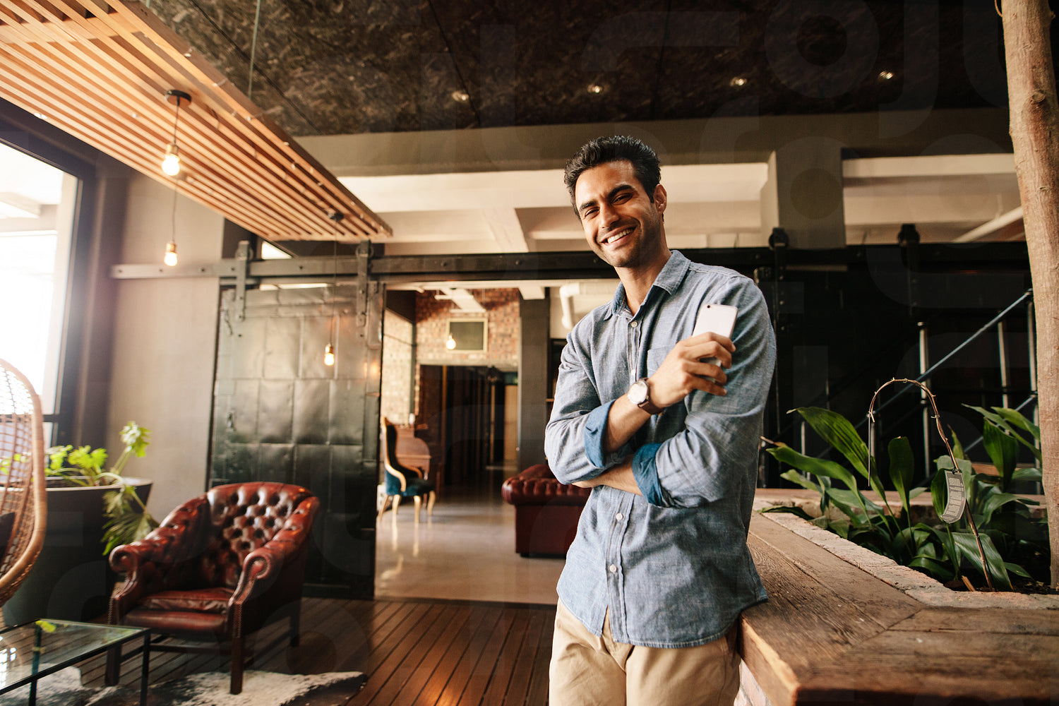 Portrait of handsome young man relaxing in modern office looking at camera and smiling. Creative professional taking break.