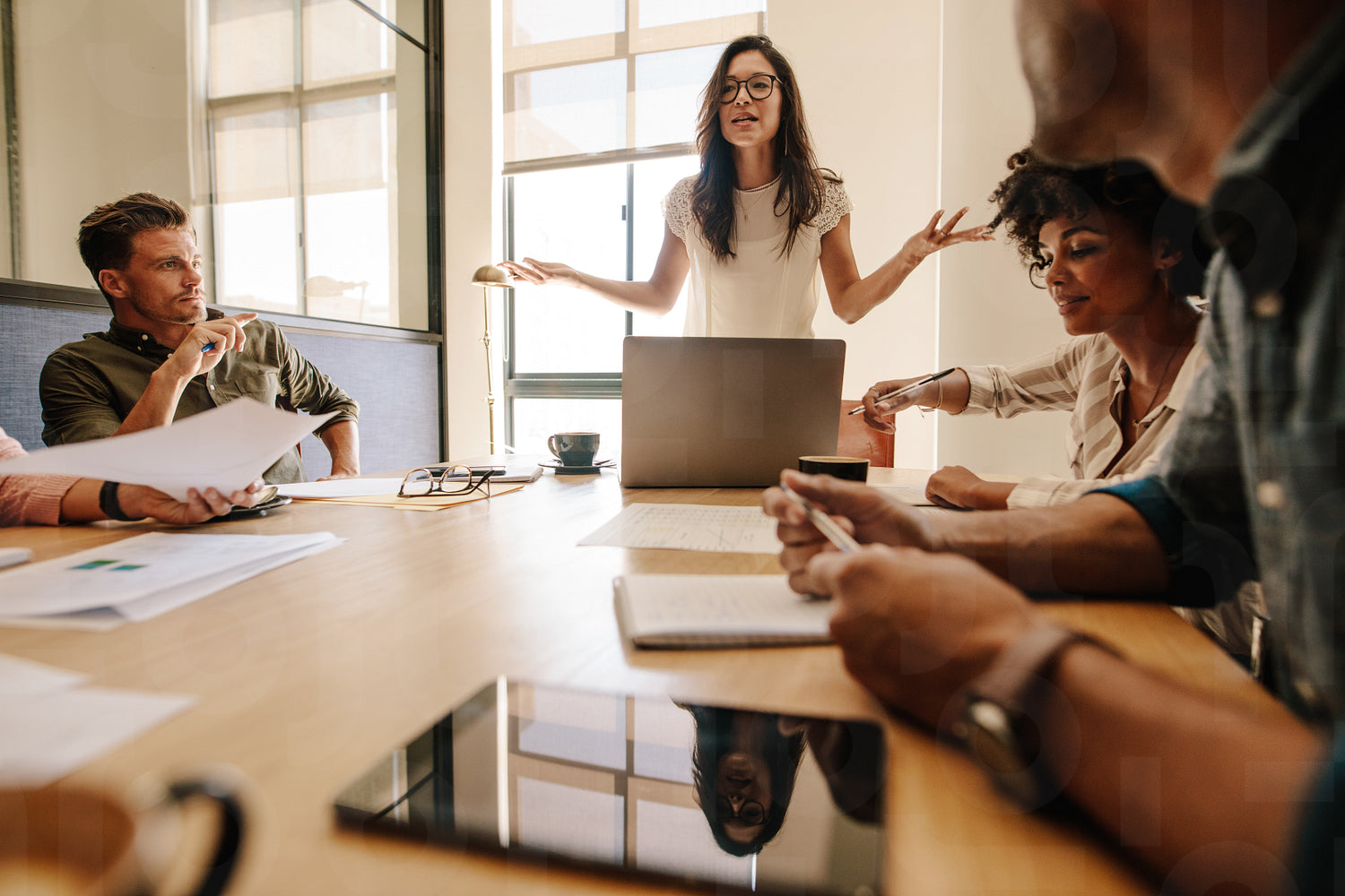 Shot of young businesswoman giving presentation to her colleagues sitting around table in conference room. Multi ethnic business people during meeting in office.