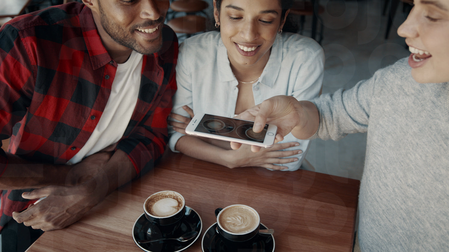 Woman taking photos of coffee while sitting with friends at a coffee shop. Friends at a cafe taking photos of coffee cups on table.