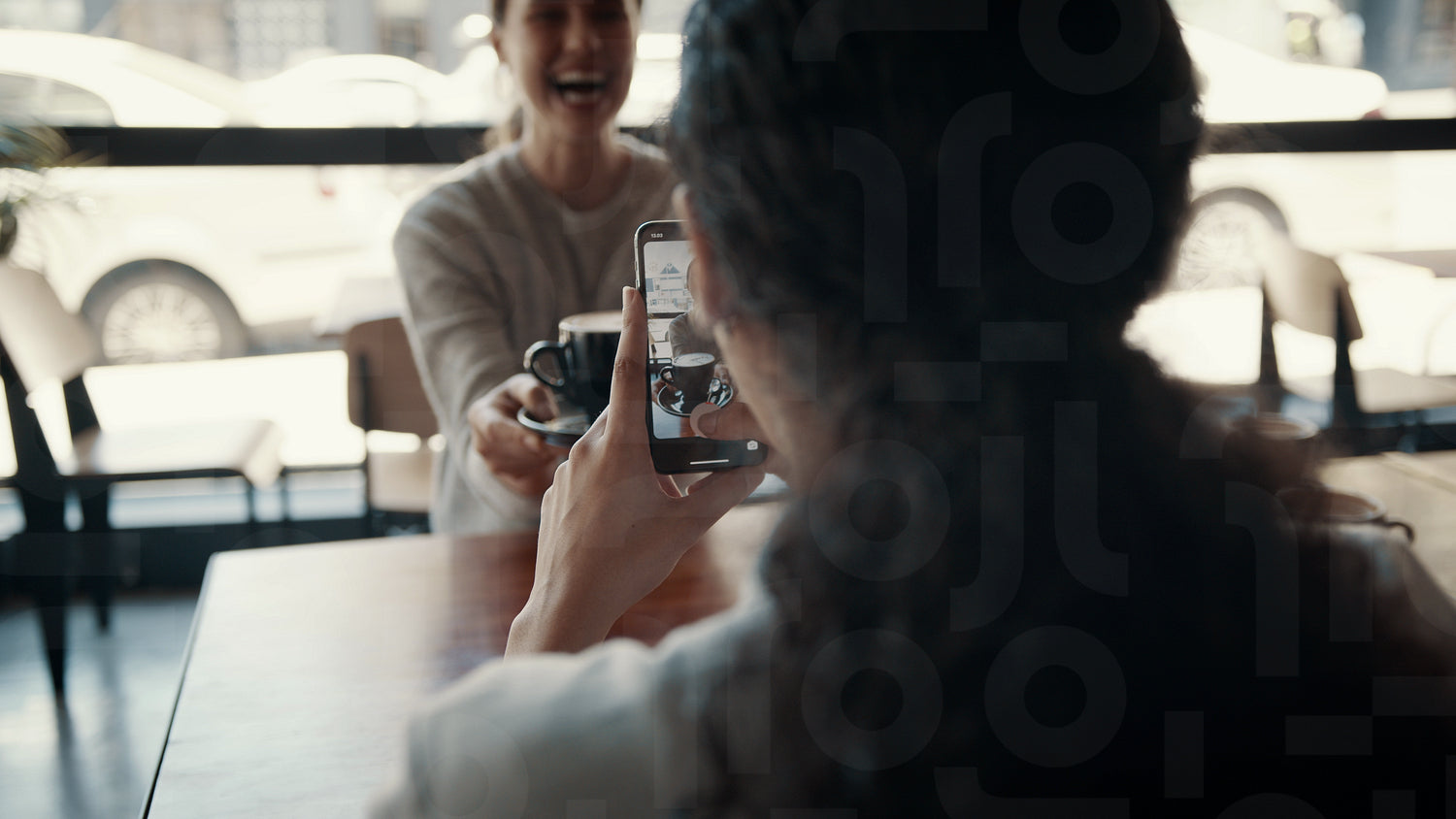 Woman sitting at a coffee table posing for a photograph holding a coffee cup. Woman taking photo of a female friend with her mobile phone at a coffee shop.