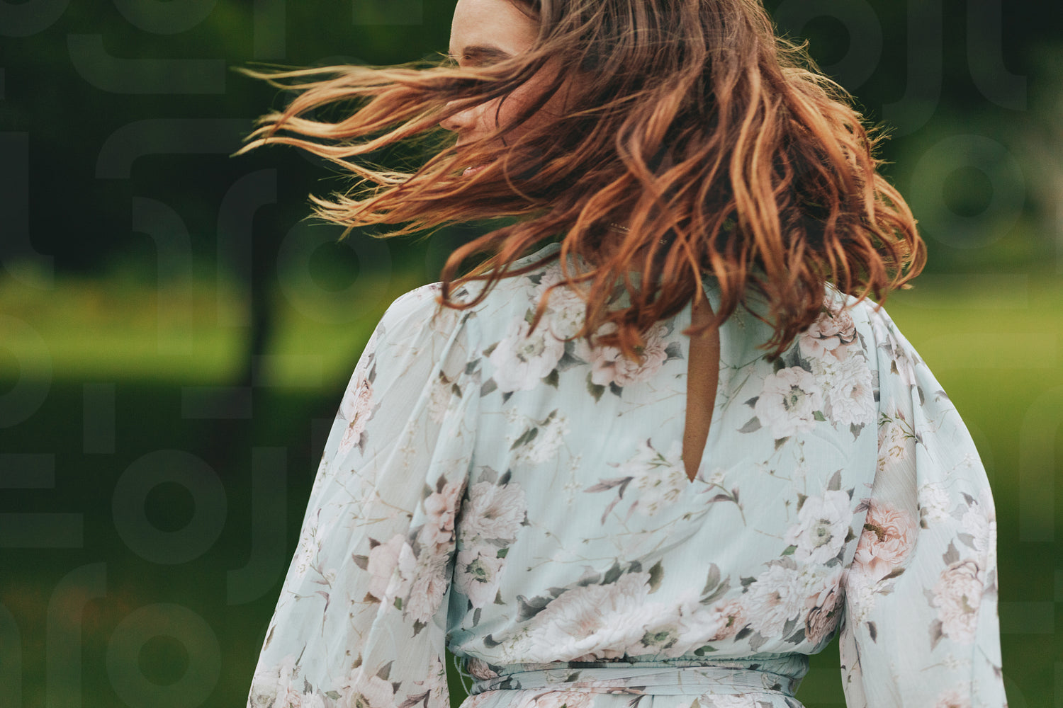Beautiful woman turning around at the park. Rear view of a woman with brown hair outdoors.