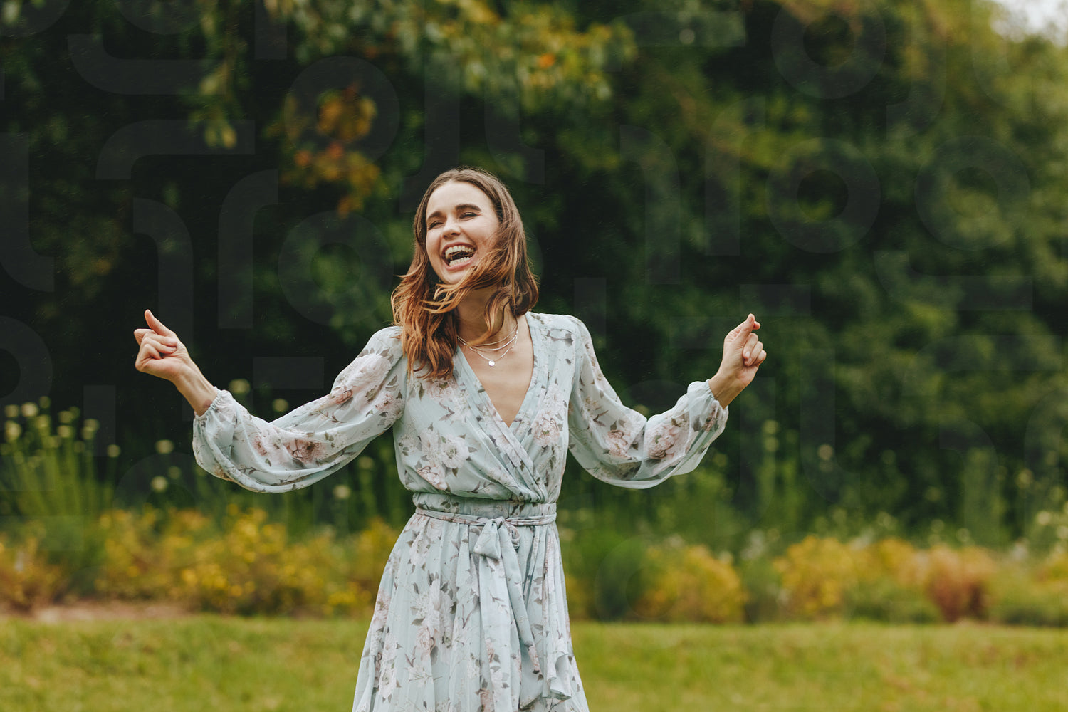 Cheerful young woman dancing at the park. Beautiful woman enjoying on picnic outdoors.
