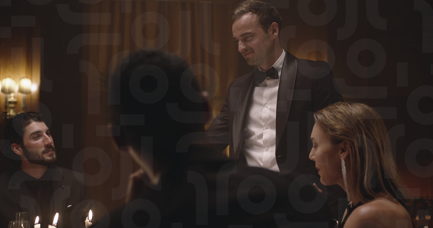 Happy friends toasting with wine at gala night party. Group of men and women celebrating with drinks at dinner party.
