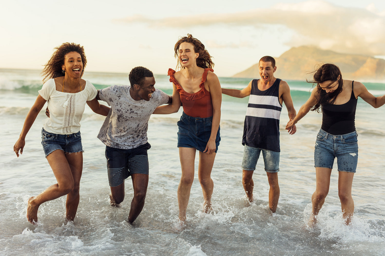 Friends on vacation playing in the sea. Multiethnic men and women friends running in the sea water holding each other.