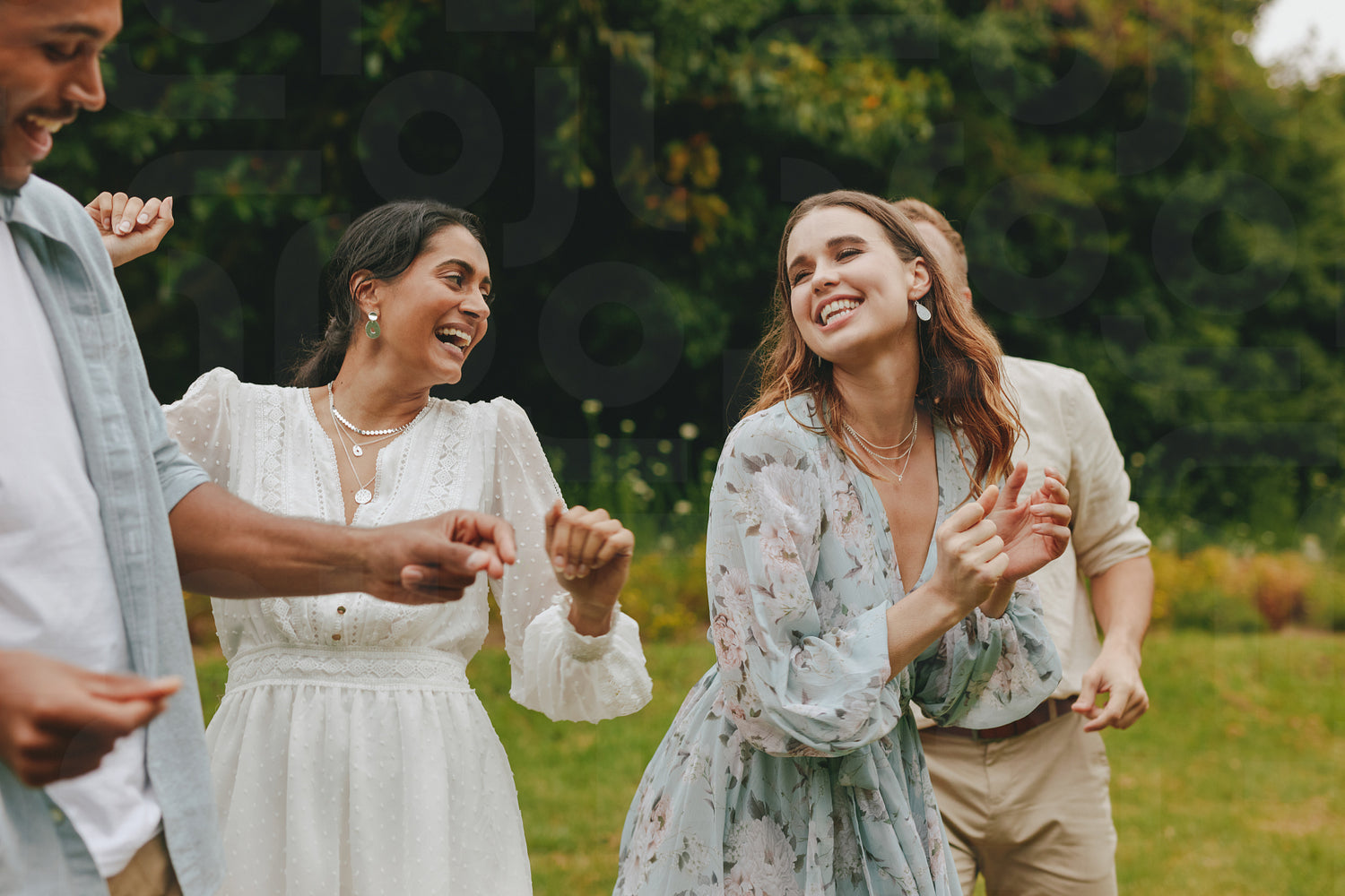 Cheerful young people dancing at the park. Group of men and women enjoying on picnic outdoors.