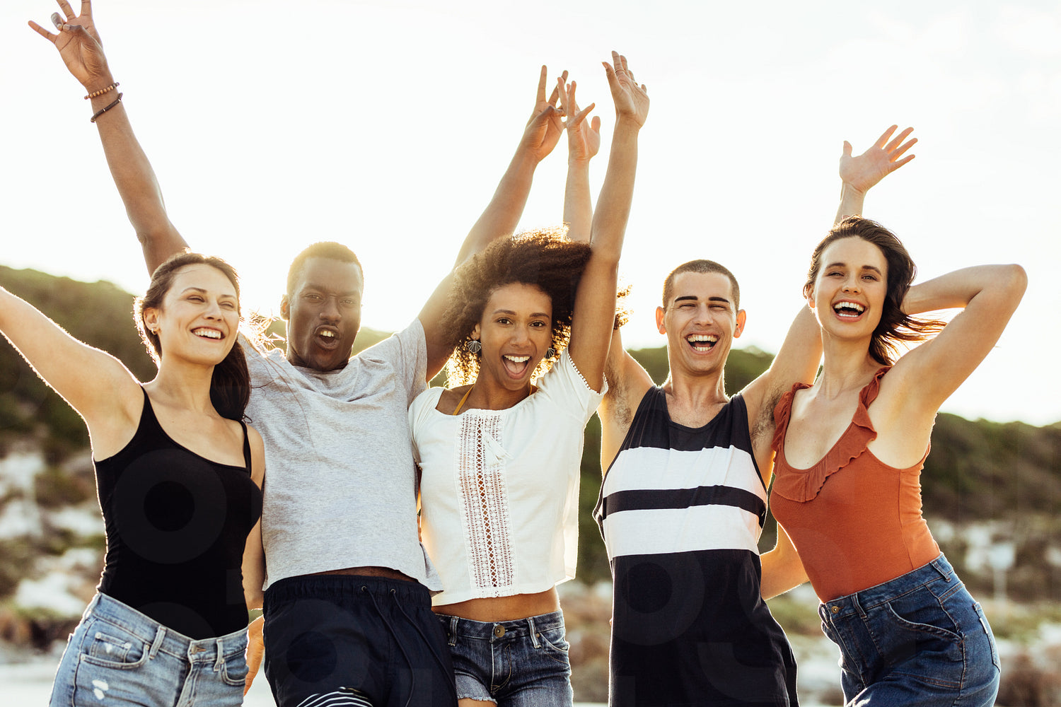 Happy friends enjoying on a vacation. Cheerful men and women standing together outdoors dancing and having fun.