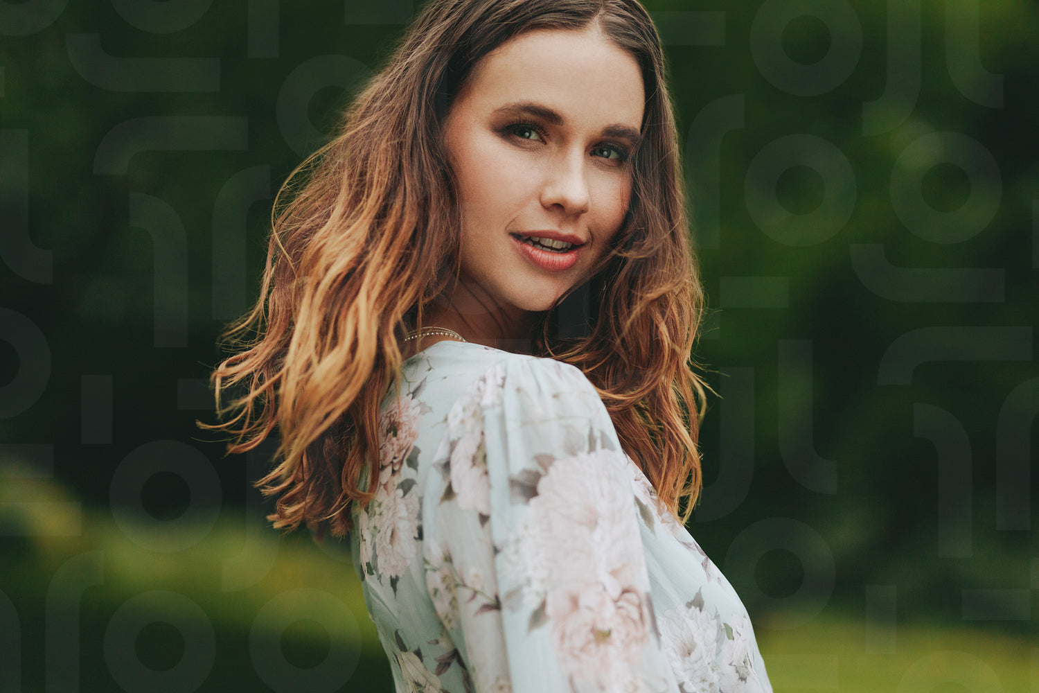 Beautiful woman looking at camera in the park. Woman with brown hair looking over her shoulder outdoors.