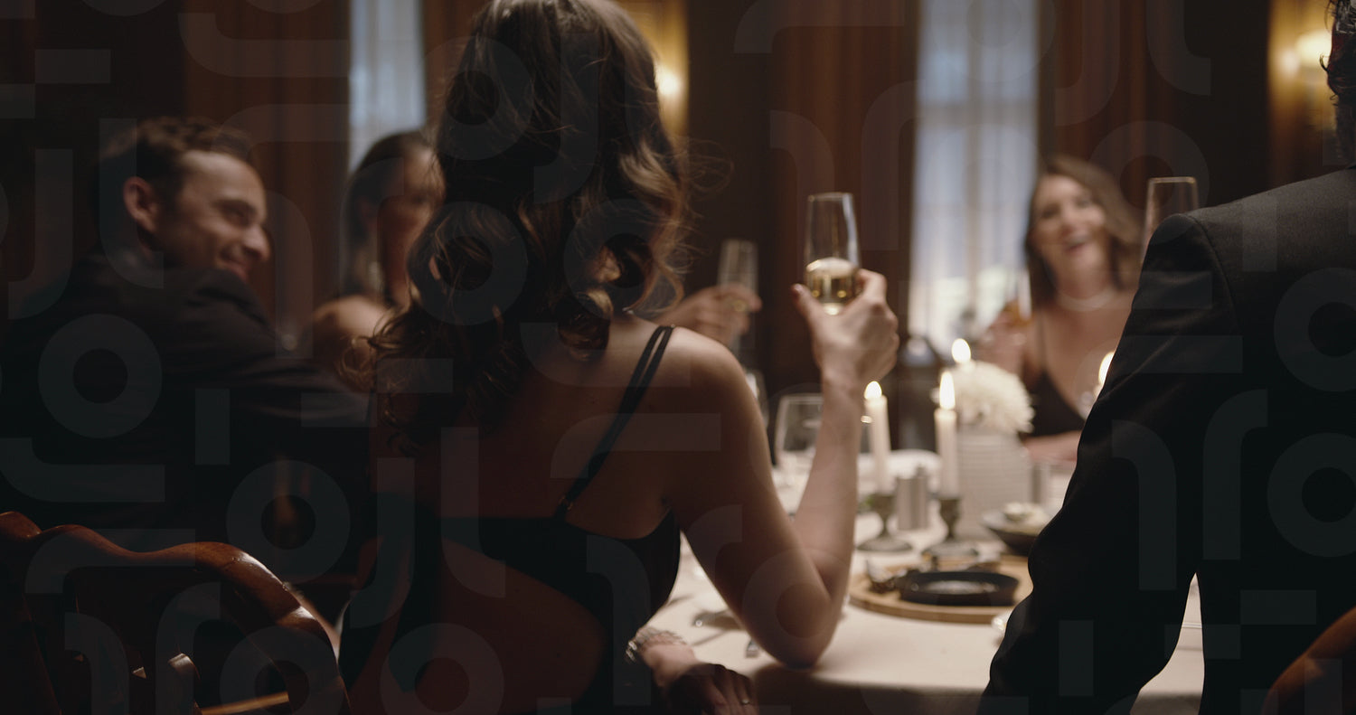 Group of friends sitting around a table in and having wine at dinner party. High society people having gala dinner party.