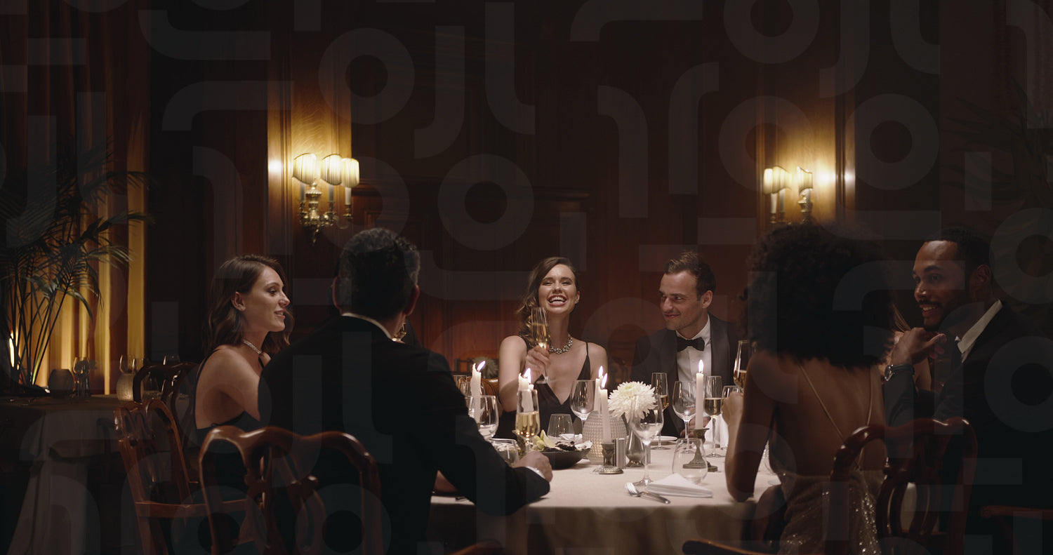 Group of men and women celebrating with wine at dinner party. Friends enjoying dinner at a gala night.