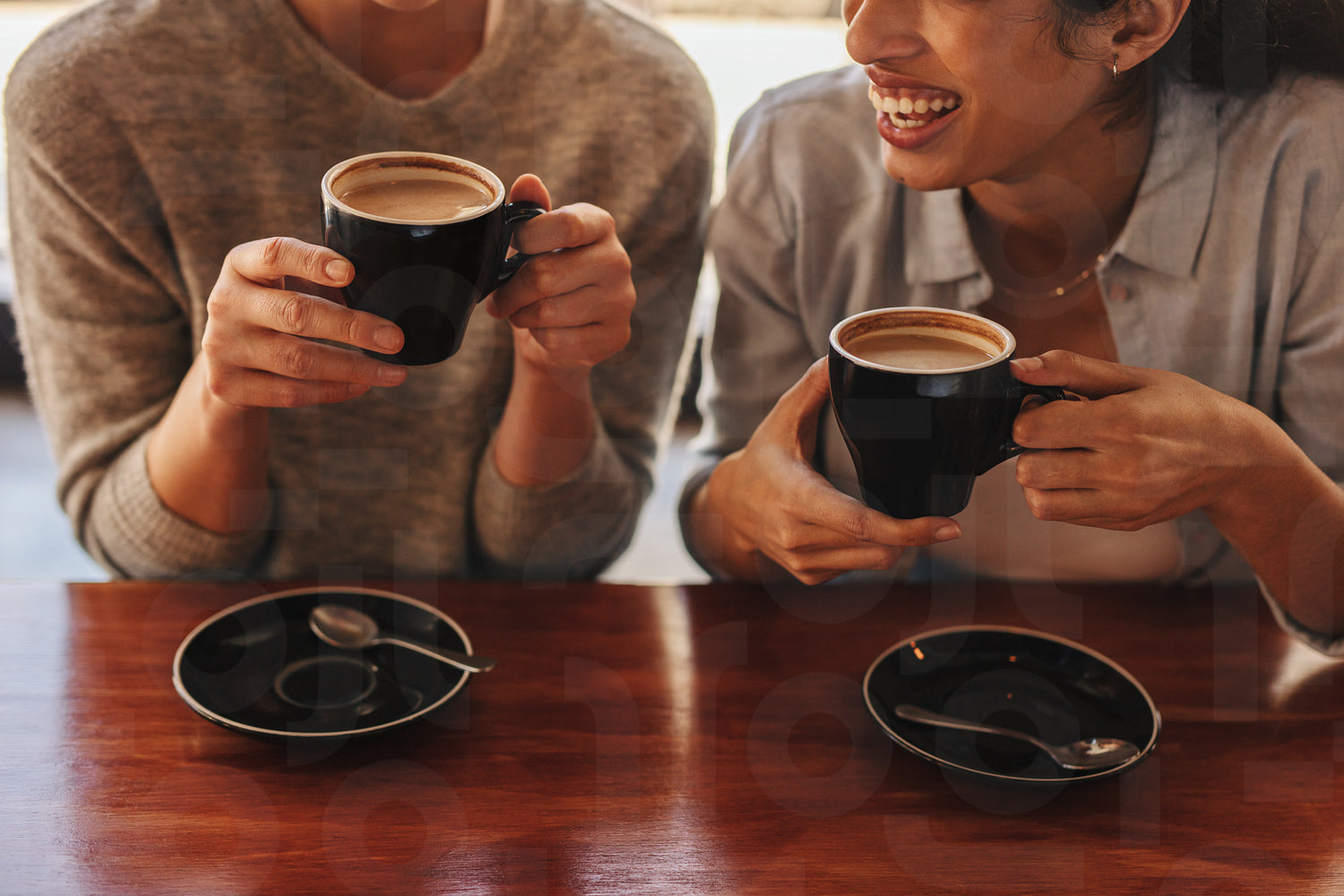 Cropped shot of two friends having coffee together in a coffee shop. Woman friends in a cafe having coffee.