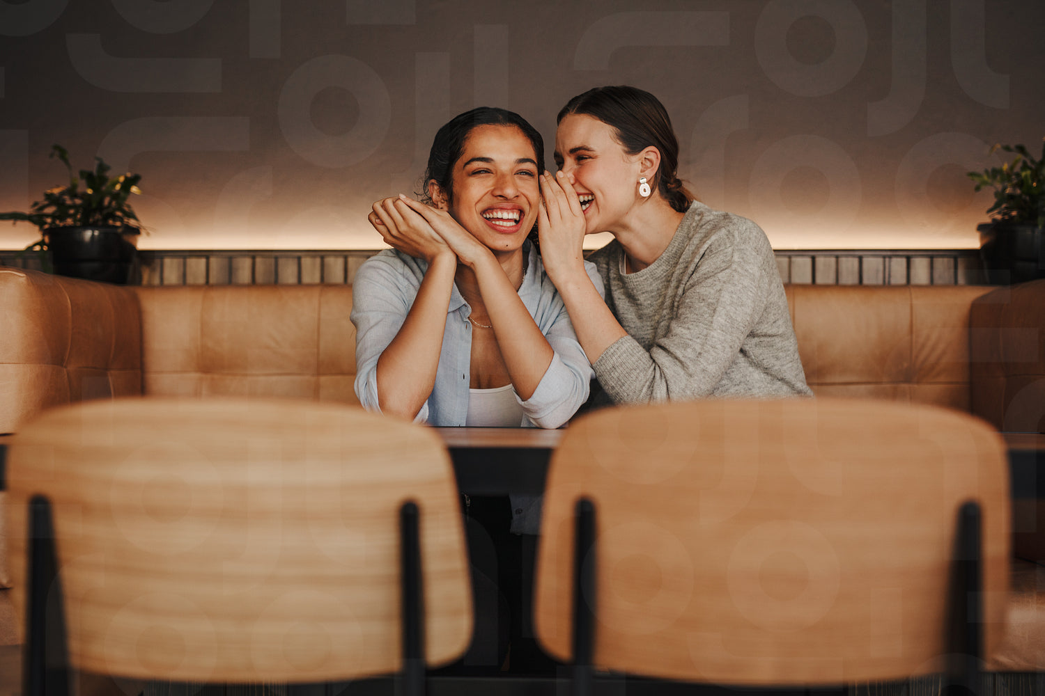 Woman whispering something funny in ears of her friend while sitting at cafe table. Two women gossiping in a coffee shop.
