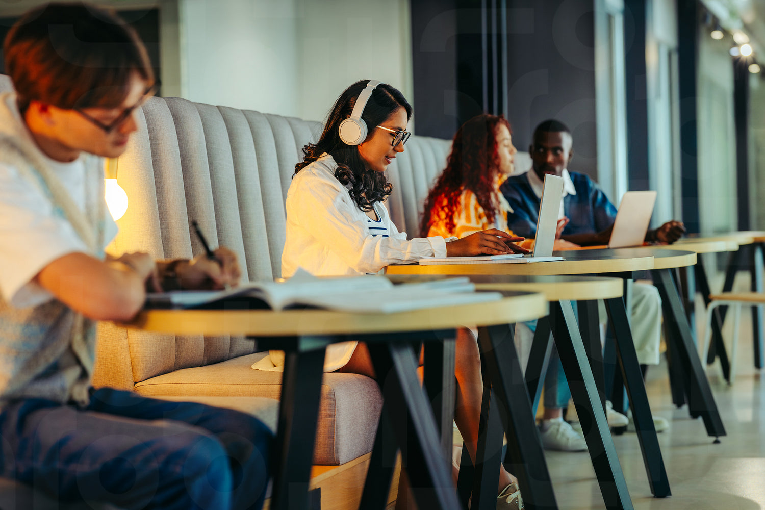 College students studying in a modern library environment using laptops and books for collaborative learning and focus