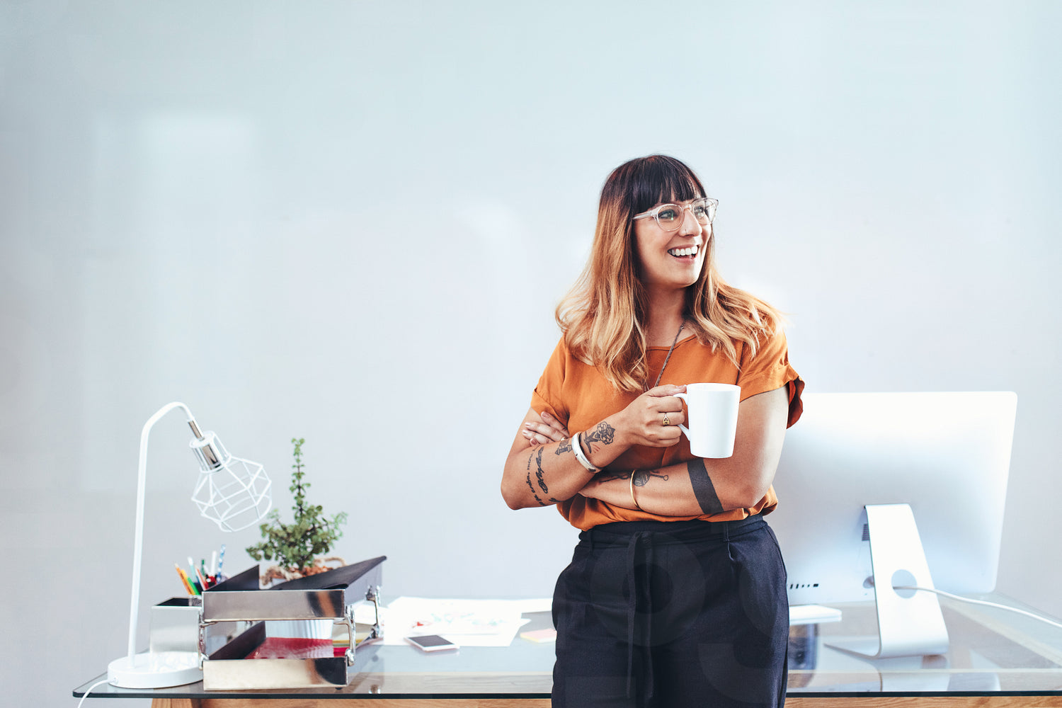 Portrait of a smiling businesswoman standing at her desk holding a coffee cup and looking away. Woman entrepreneur taking a break enjoying a cup of coffee.