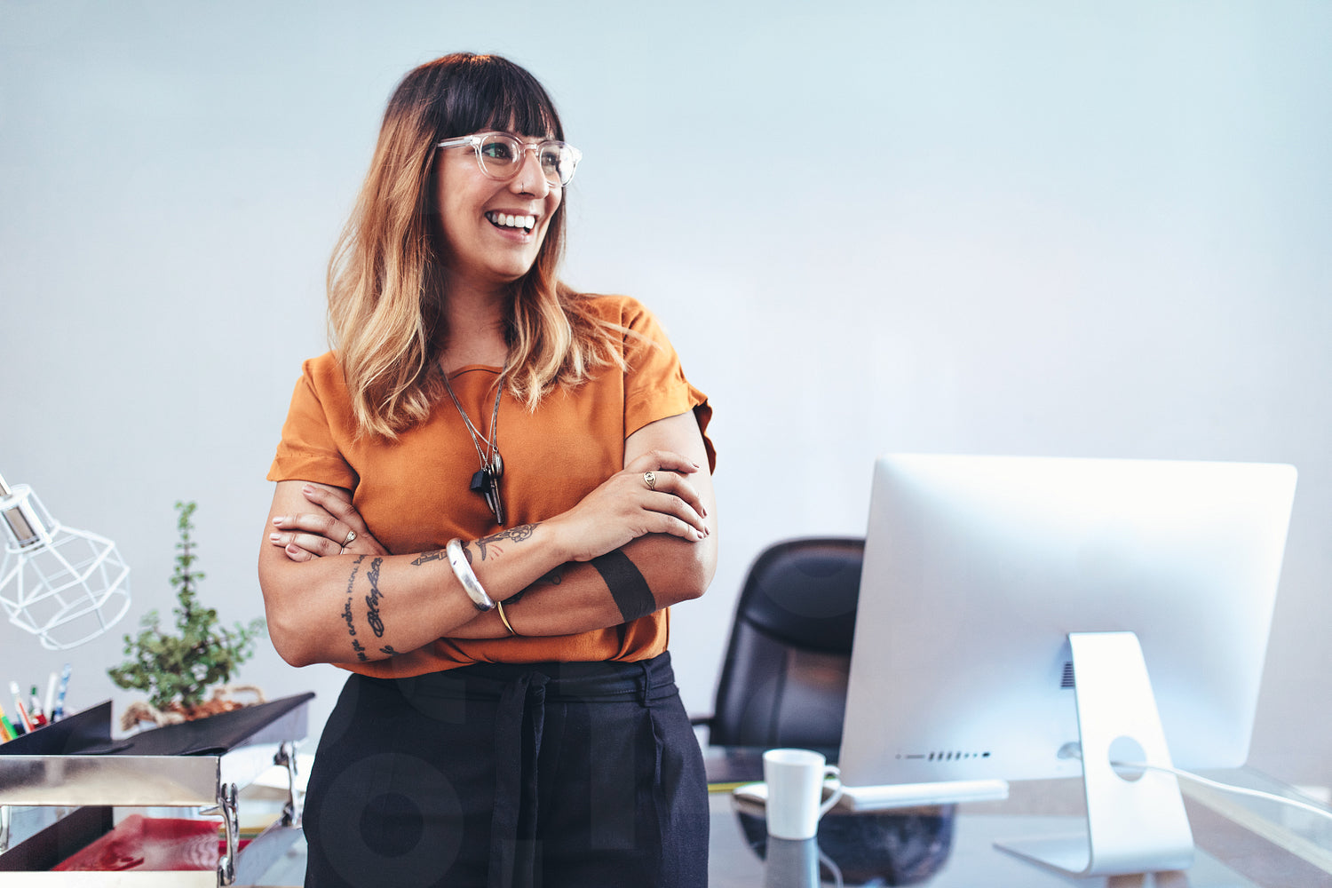 Portrait of a smiling businesswoman standing at her desk in office and looking away. Cheerful woman entrepreneur taking a break from work standing in her cabin at office.