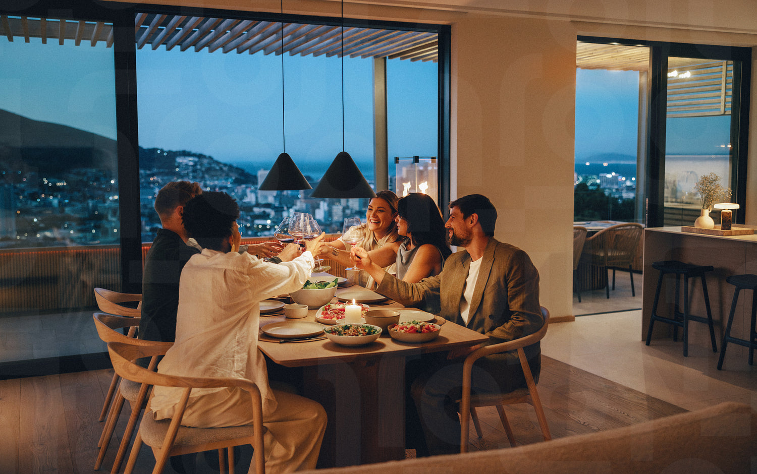 Friends enjoying dinner together at home with a scenic evening backdrop
