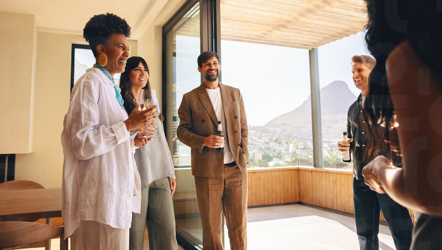 Close friends spending time together enjoying beverages and conversation in a stylish home. A comfortable and welcoming atmosphere with panoramic outdoor views.