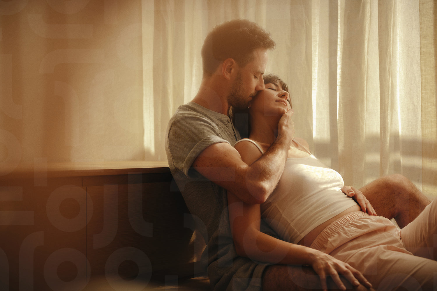 Romantic scene of a couple in a warm embrace, sharing a private moment with love and intimacy, illuminated by warm light through sheer curtains. This photo has intentional use of 35mm film grain.