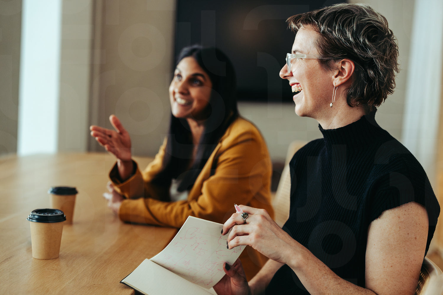 A casual meeting between colleagues in an office setting, featuring two women engaged in conversation. They appear relaxed and friendly as they share ideas over coffee at a wooden table.