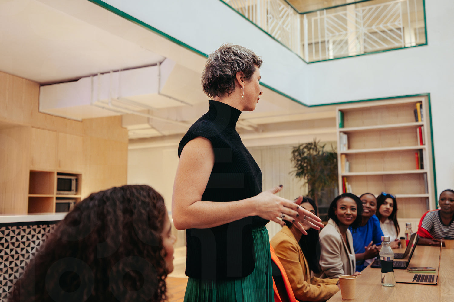 Group of diverse professionals engaged in a lively agency office meeting