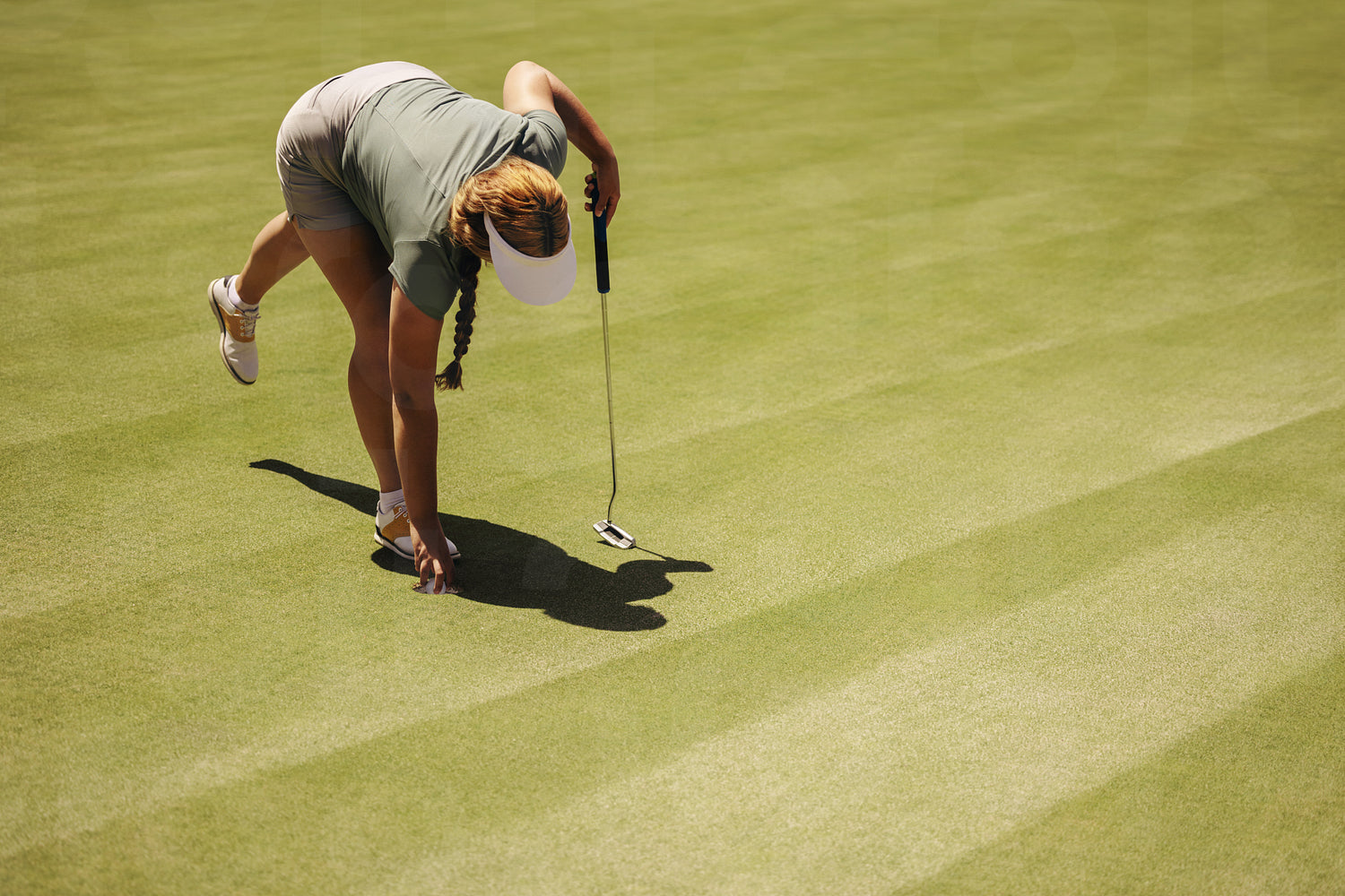 A female golfer prepares to putt, placing the ball on a vibrant green. Capturing the sport of golfing with focus and precision, with the immaculate grass of the green showcasing this.