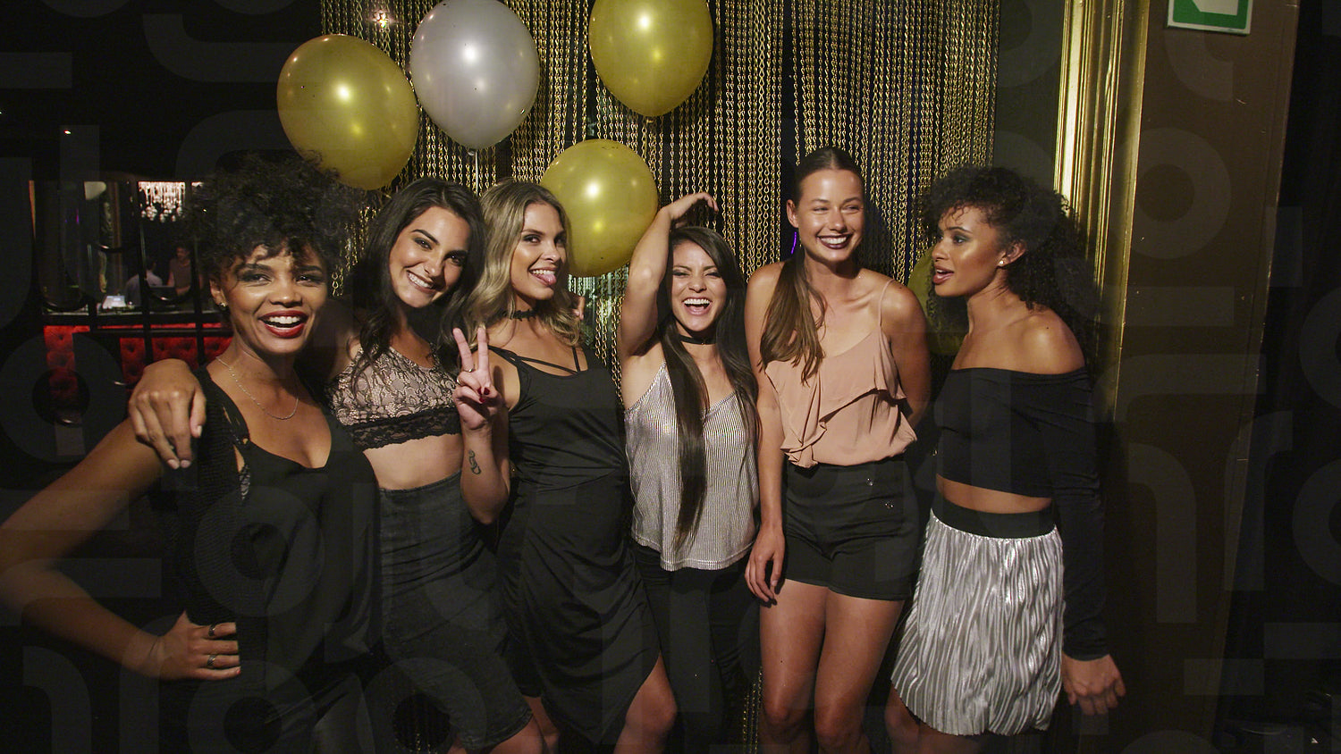 Group of beautiful women enjoying together at the pub party. Multi-ethnic female friends having fun at nightclub.