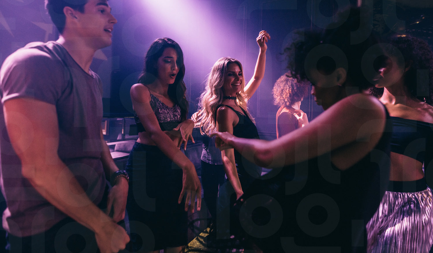 Group of friends dancing in club. Young men and women having fun at disco nightclub.
