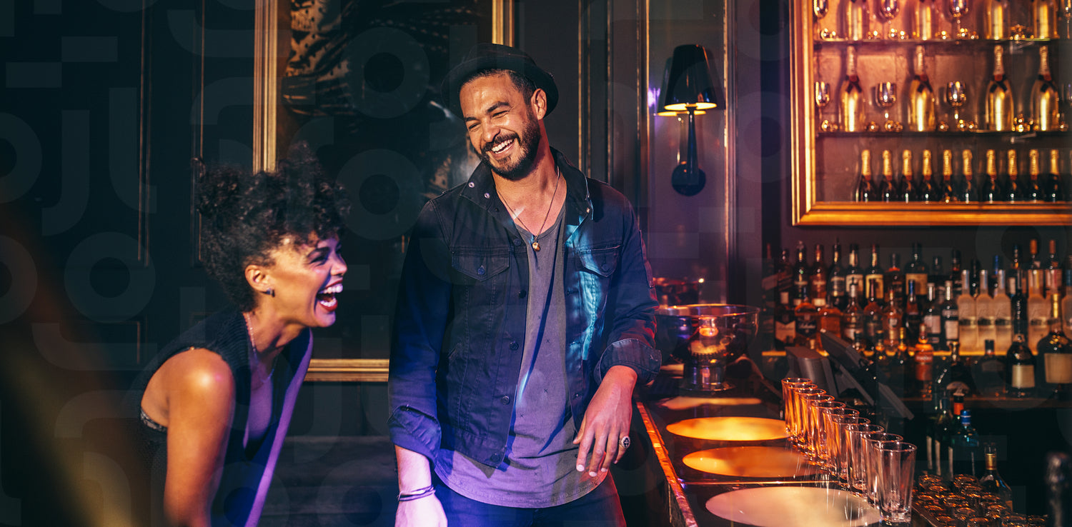Happy couple at lounge disco bar counter and laughing. Young people having fun in a club.