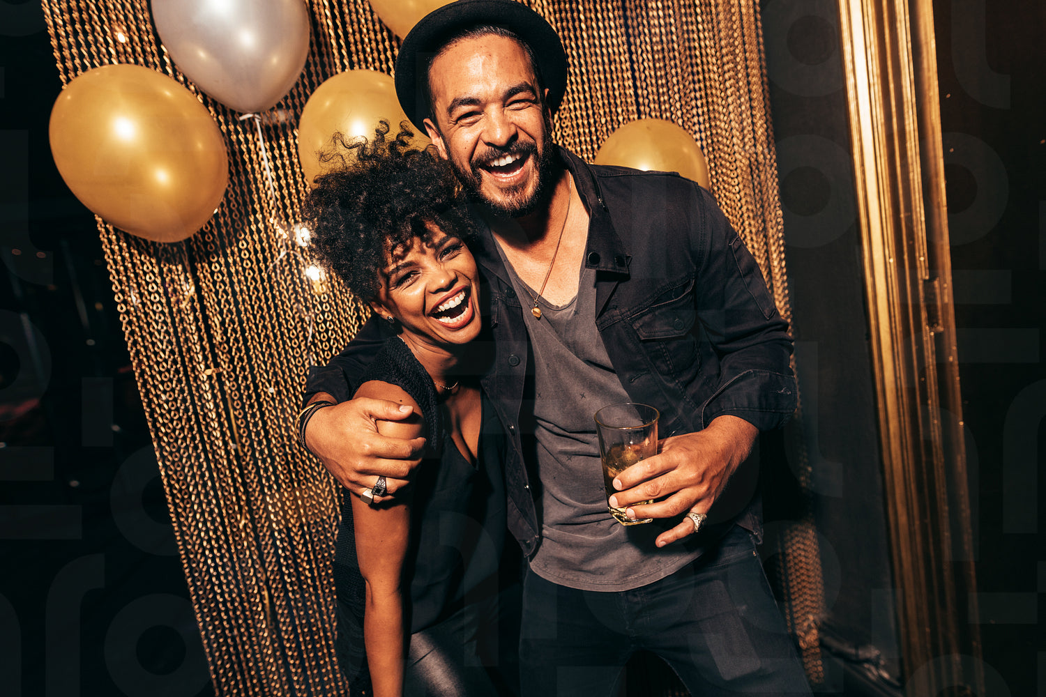 Portrait of happy young couple together at nightclub. Young people enjoying party.