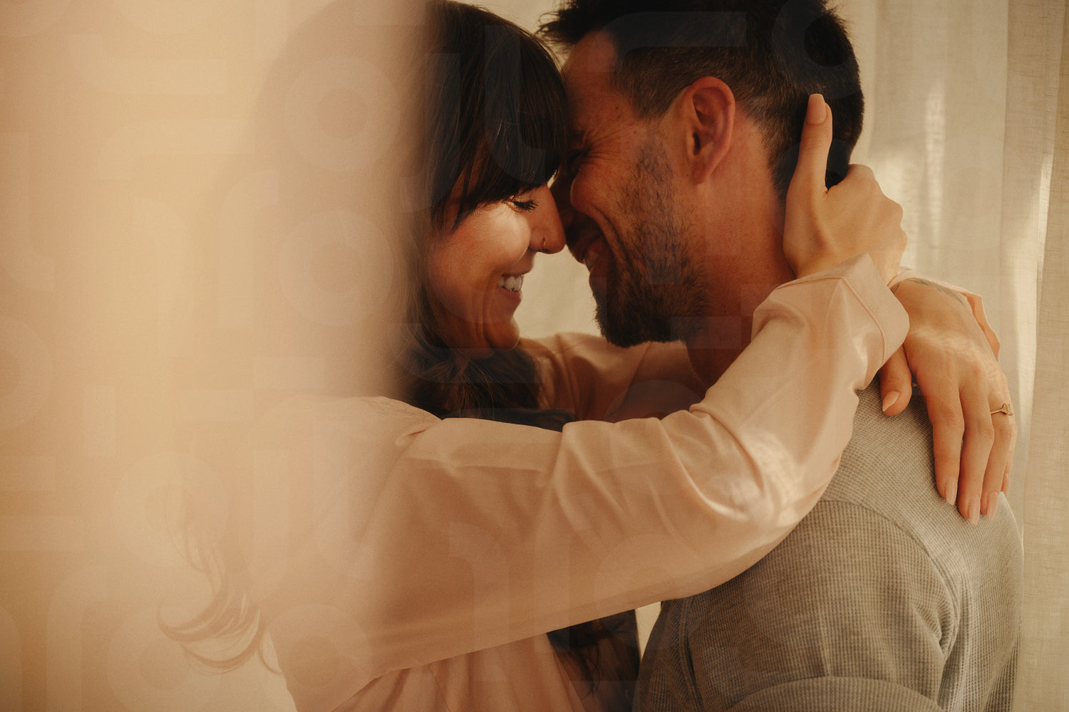 Joyful couple embracing warmly, highlighting affection and happiness. Soft lighting evoke love, connection, and comfort. This photo has intentional use of 35mm film grain.