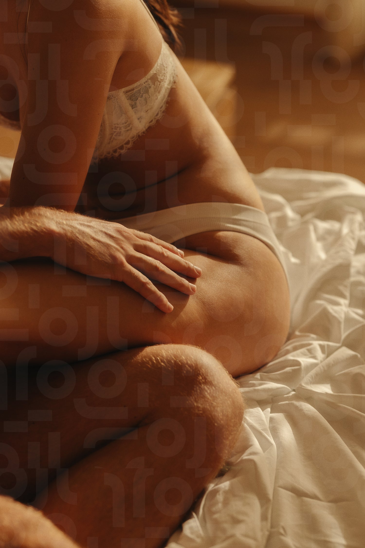 A close-up image capturing an intimate moment between a couple. A young woman feels a warm touch of a her partners hand on her body. This photo has intentional use of 35mm film grain.