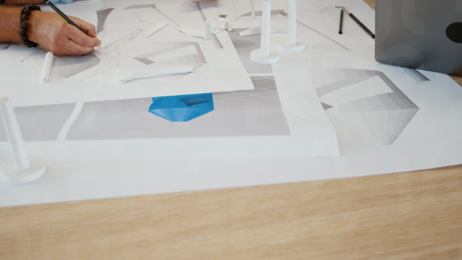 Group of sustainable engineers designing a wind turbine using 3D drawings and models in an office. Team of creative business people having a discussion as they collaborate on a wind energy project.