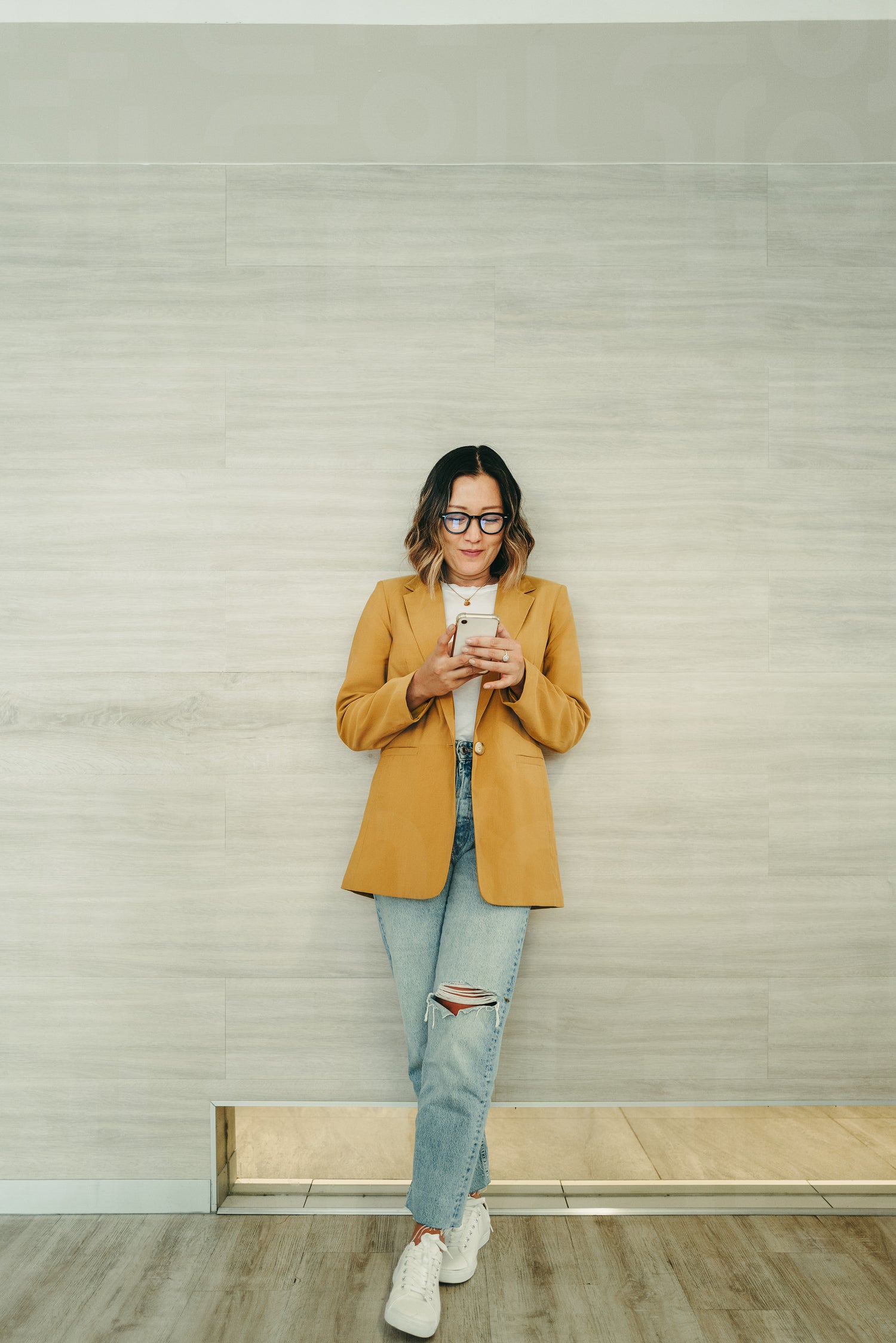 Young businesswoman reading a text message while working in a modern workplace. Cheerful female entrepreneur communicating with her business clients using a smartphone.