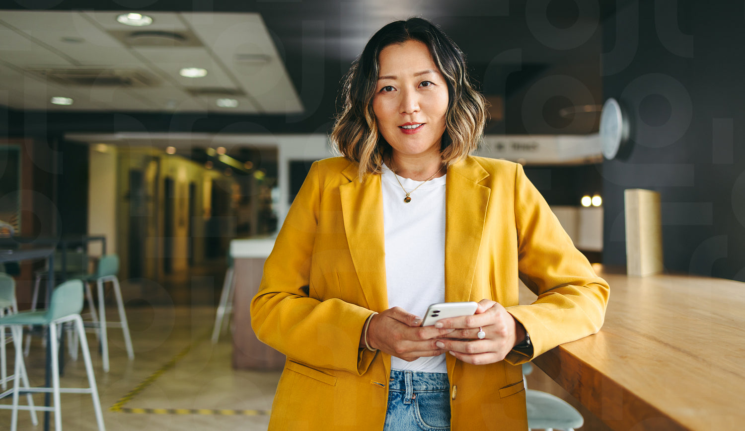 Ethnic businesswoman holding a smartphone while standing in a modern co-working office. Female entrepreneur sending a text message while working remotely.